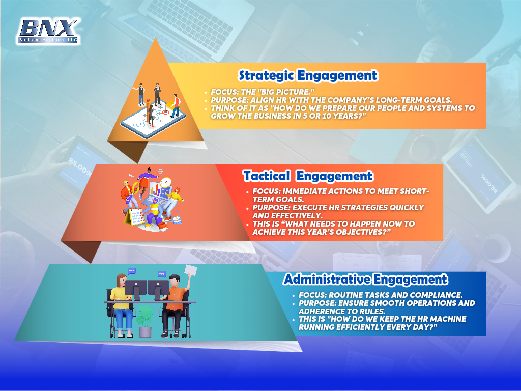 BNX Business Advisors transforms HR into a core business asset, unlocking growth, innovation, and operational excellence for your organization. Let us show you the power of aligning people strategies with your business goals.